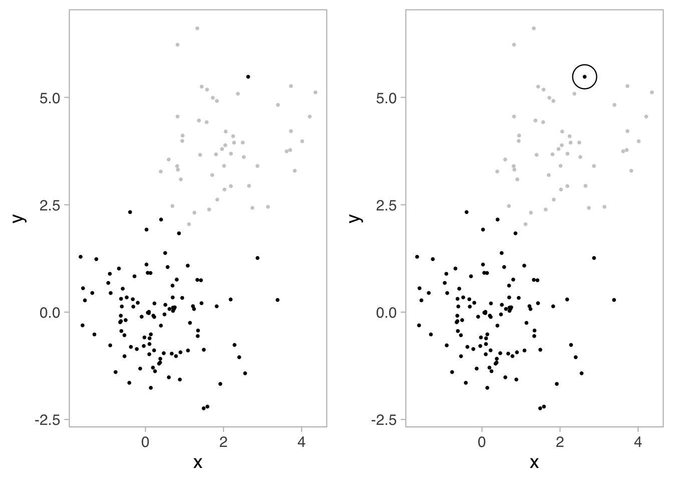 Consider how we might apply these principles to a scatterplot scenario. We assemble mental models of grouping through differences in similarity, proximity, enclosure, size, color, shading, and hue. In the left panel of Figure 16.18, for example, we naturally see two groups of data points—one in gray, the other in black—with an outlier visible among the black points.