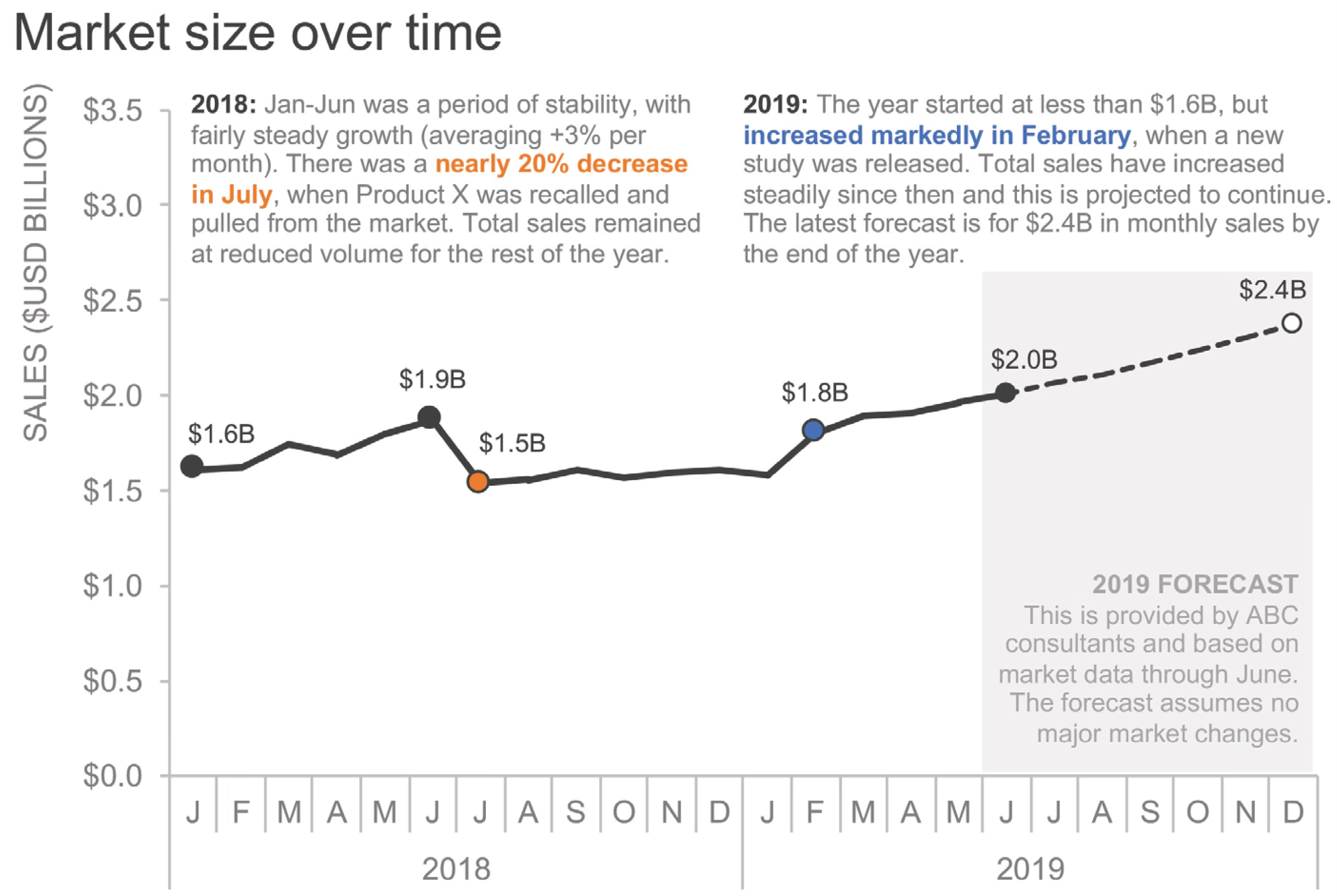 Exercise 15.3 (Market Size Over Time) Examine the time series visualization below showing market size evolution. Identify: 1. How continuity organizes perception of trends over time 2. How similarity (color, line style) distinguishes different data series 3. How enclosure or other principles separate and highlight key regions