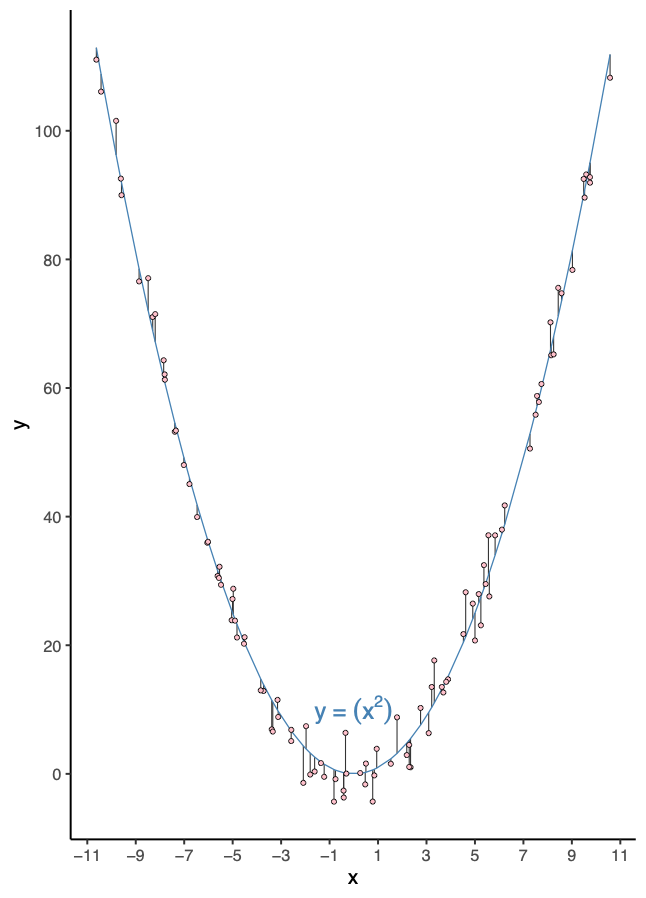 What makes this question so difficult? The fundamental problem is a mismatch between what we ask viewers to compare and what the visualization actually marks. We want to compare vertical distances from each point to the curve, but the graphic only marks two things: the data points themselves and the fitted curve. The vertical distances—the very thing we need to assess—remain unmarked. Viewers must mentally construct these distances, computing vertical gaps from visual elements that don’t directly encode them. This mental computation is error-prone because our visual system naturally wants to assess the closest perpendicular distance to the curve, not the vertical distance we care about. The curvature compounds this challenge: each point sits at a different angle relative to the curve, making consistent vertical comparison nearly impossible.