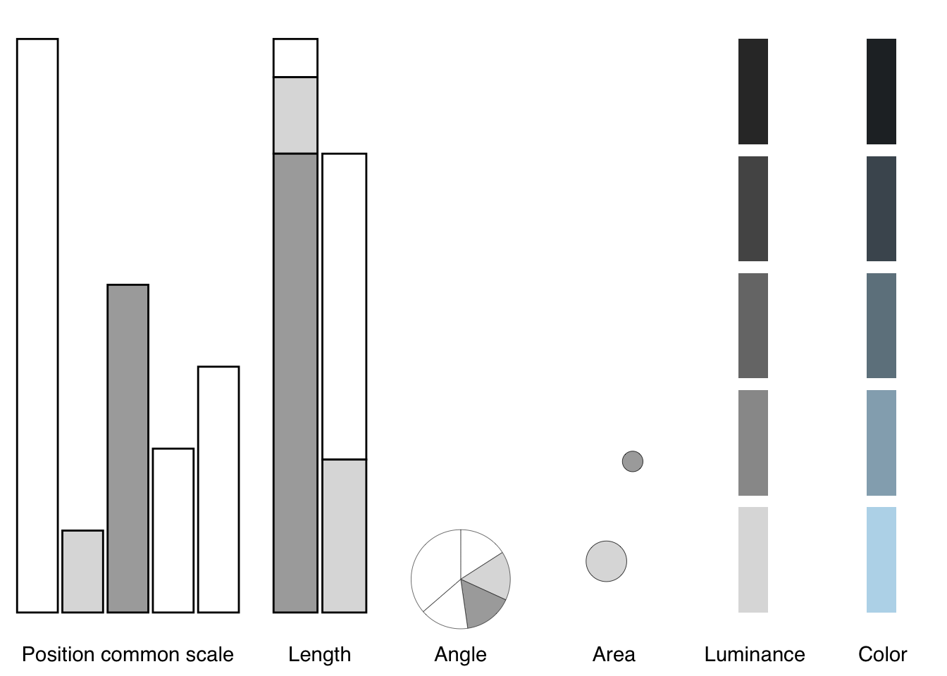 Placing encodings in the context of chart types, Figure 16.21, we decode them from more to less accurate, position encoding along common scales (e.g., bar charts, scatter plots), length encodings (e.g., stacked bars), angles (e.g., pie charts), circular areas (e.g., bubble charts), luminance, and color (Munzner 2014):