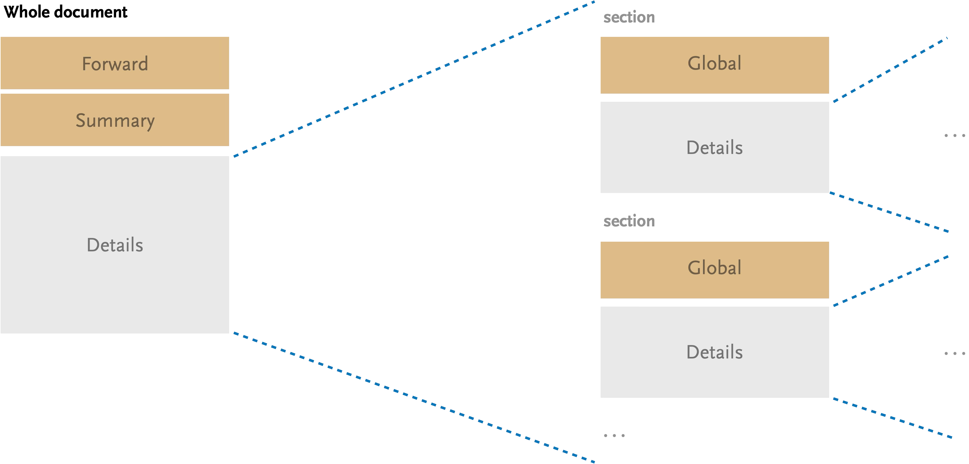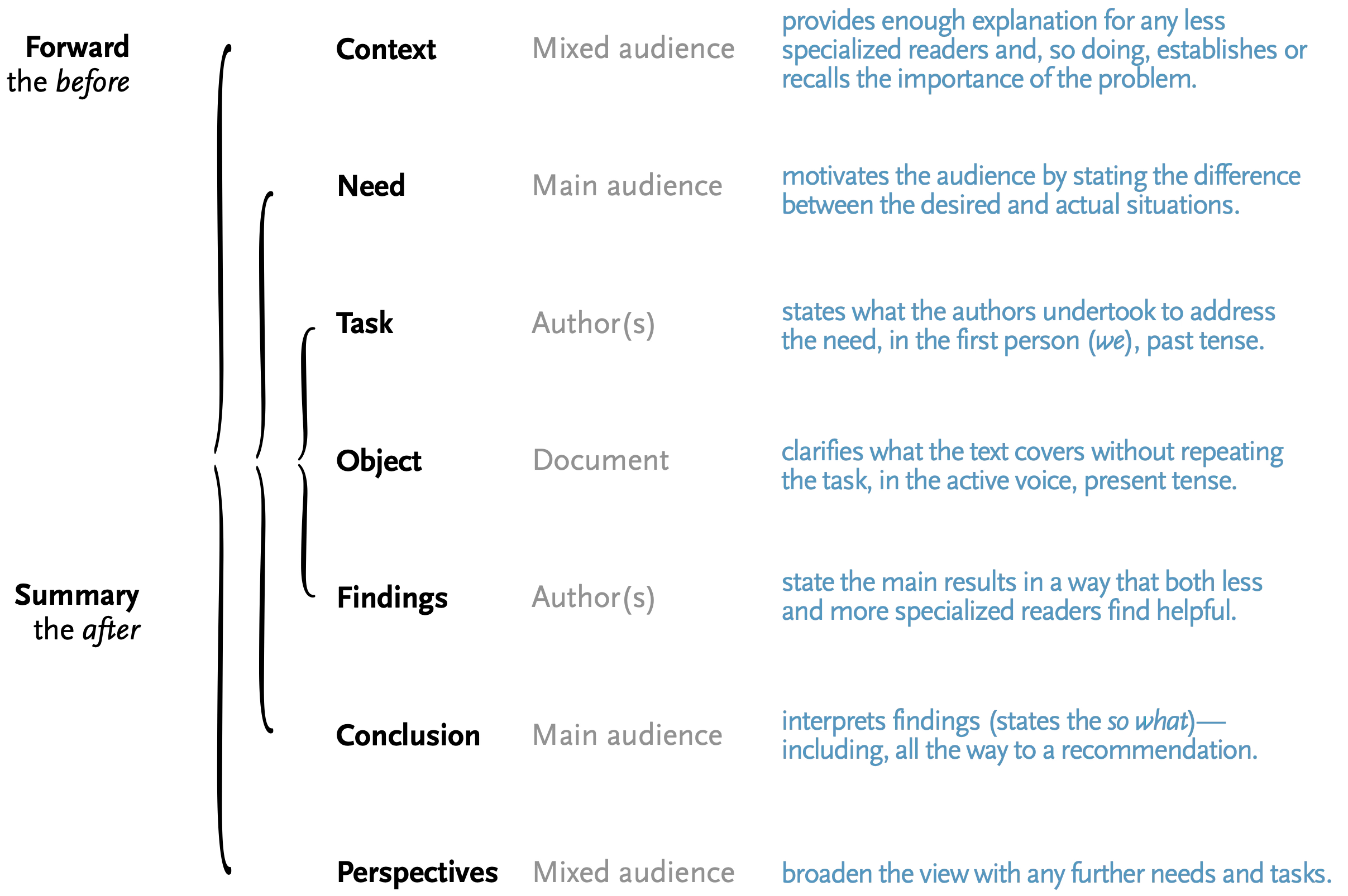 Doumont (2009) observes this self-similarity: documents have a forward (orienting the reader), summary (the core message), and details (supporting evidence). But within each section, the same pattern repeats—a brief orientation, a summary of that section’s point, then the details supporting it. This nesting continues down to the paragraph level, where topic sentences serve as summaries and supporting sentences provide detail.
