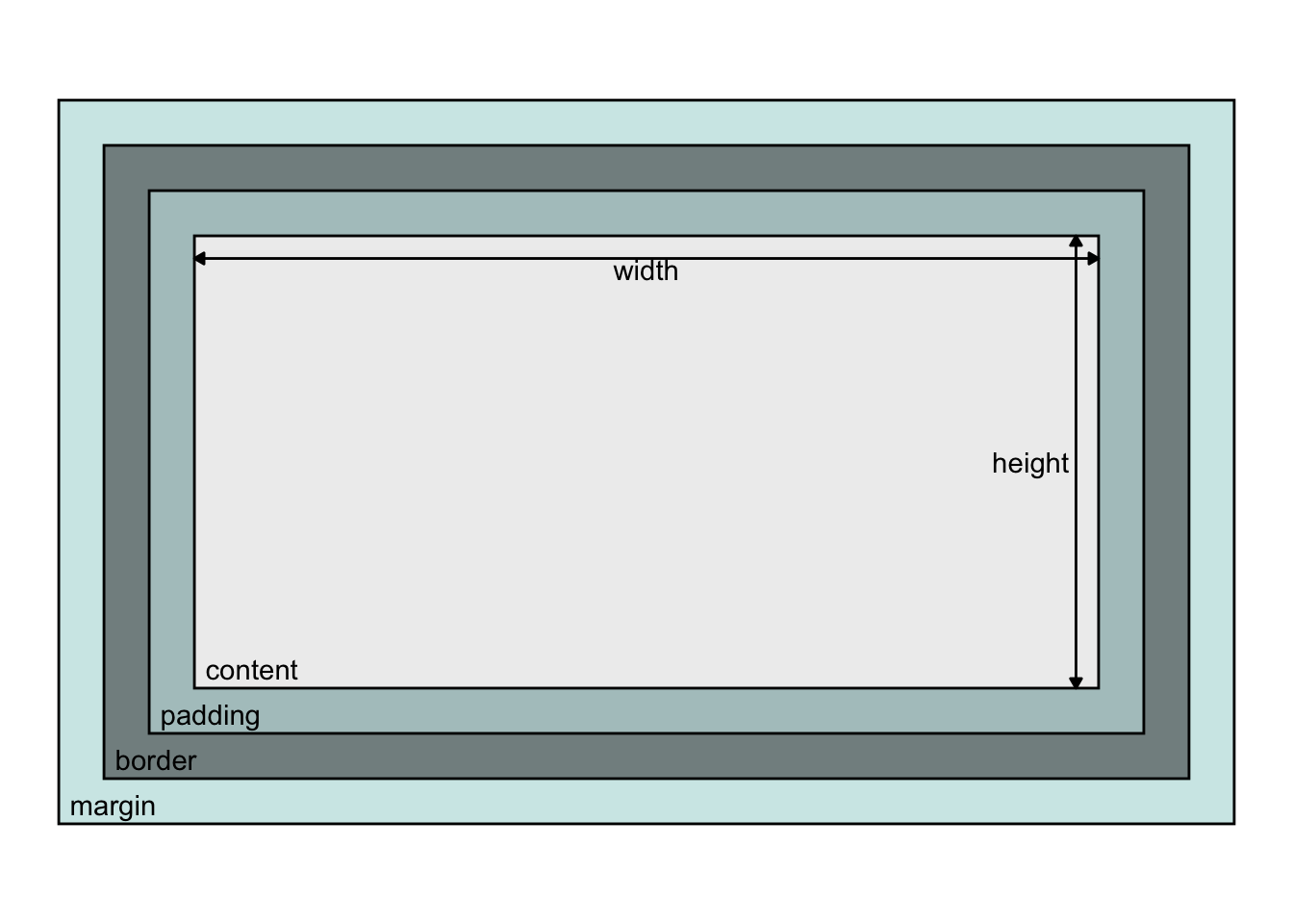 The dimensions of content in an html document, whose dimensions can be understood in terms of boxes surrounding that content, called the “box model” where, by default width and height attributes for an element relates to the content, and the remaining space around that content is specified by its padding, border, and margin: