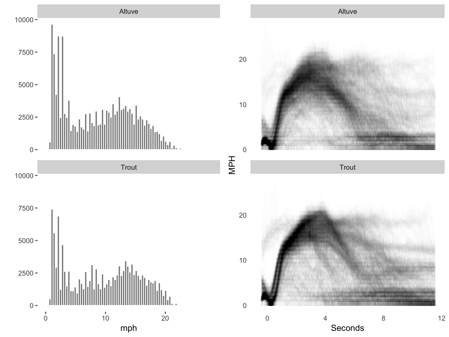 labs(x = 'Max Speed: Trout (red), Altuve (blue)', y = '')